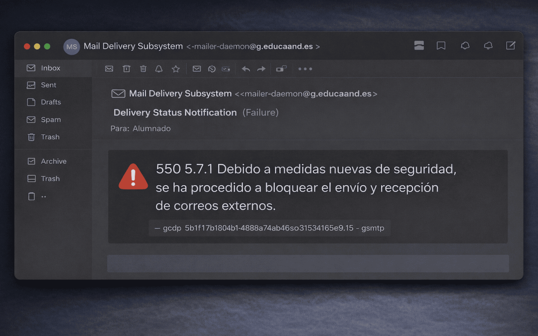 Lo más preocupante es que esta no es solo una cuestión técnica, sino profundamente pedagógica. Lo que se está bloqueando no es simplemente el spam o el correo no deseado; se está bloqueando el acceso a herramientas creativas, la continuidad de proyectos, la autonomía digital del alumnado y la conexión entre lo que enseñamos en el aula y la forma en la que se trabaja en el mundo profesional. Estamos intentando enseñar competencias digitales con cuentas de correo que no pueden interactuar con el exterior digital, como si quisiéramos enseñar a navegar manteniendo el barco amarrado al puerto.